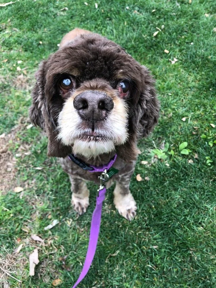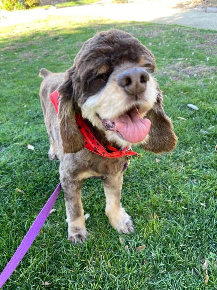 Now named Leroy Brown, this old boy spends most of his time relaxing. He has a 10-year-old Cocker sister named Daisy Mae and a Labradoodle puppy named Waffles that he gets to socialize with. He enjoys playing with toys and rolling around in his dog bed scratching his fuzzy back. His mom makes sure Leroy sees a canine ophthalmologist who helps keep his eyes comfortable due to his dry eye and cataracts.