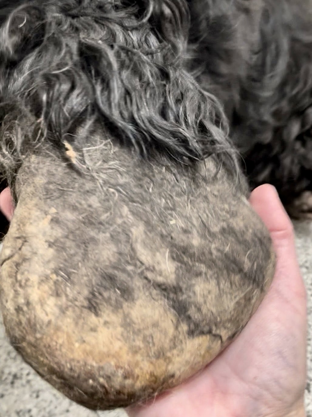 This poor guy broke our hearts into a million pieces. 💔 We desperately tried to find a vet that could do a sedated shave down but no one could accept him at the last minute. Then we called multiple groomers, begging to pay a premium to get him shaved down. We finally found one that was hesitant to attempt a shave down after seeing Ravi in person but luckily they said yes. It took four people to work on him. He was flailing (needed to be muzzled) and three people were holding him while one was shaving him as quickly as possible. He had a bath but the odor was so deep in his skin that he needed additional bathing to smell fresh and clean.