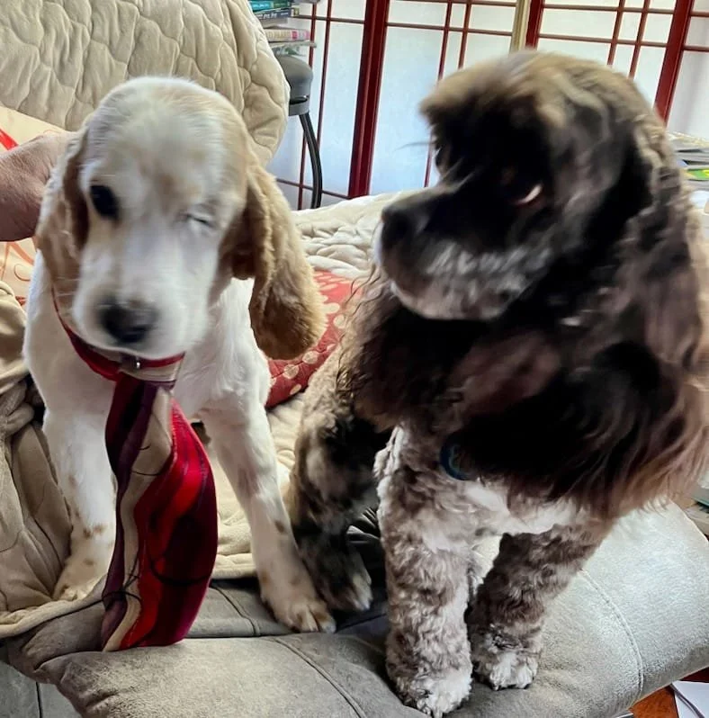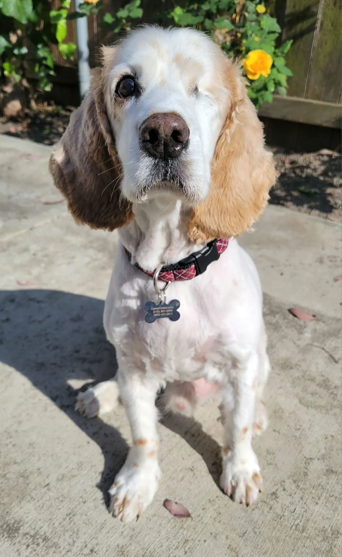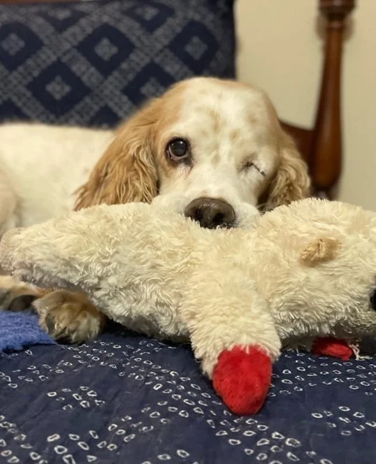Rescued at 8-10 years of age, Noodles is a very affectionate cocker mix. He joined Camp Cocker via our Freedom Flight program in June 2023 after a long plane ride from Mongolia. He had some trust issue with strangers, especially fast moving strangers who don't give him a moment to sniff and give consent before touching him, but he loves meeting other dogs and doesn't even react when they bark at him. He’s a pretty easygoing dude! Noodles does have some hearing loss but he can hear loud noises, like whistles and squeaky toys. His favorite toy is his lamb who traveled with him from Mongolia. Noodles had to have one of his eyes removed due to glaucoma, but a veterinary ophthalmologist examined him and said his remaining eye is healthy with good vision. He’ll just need to keep getting eye drops to keep that eye healthy.