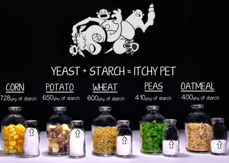Now, what do you want to avoid in the first three to five ingredients of the food label? Anything with corn. No corn, no corn meal, no corn by-products, no corn, no way, no how. Corn is very cheap and a common filler used by a lot of commercial dog food manufacturers. In fact, there is a “prescription” vet diet marketed as a weight loss food that is nearly all corn. The thing is, corn is not easy to digest, it makes the dogs poop a lot but they are not getting any source of nutrition from a corn based diet. What begins to happen is they will not only gain weight but they will lose energy and vitality, their coats will get dull and dry and they will definitely be more prone to skin problems than dogs on a grain-free food. Some dogs are allergic to white rice, some to brown rice, some to oats, some to barley, some to other grains. Every dog is different and what we recommend is to just stay away from grains entirely and buy a grain-free food.